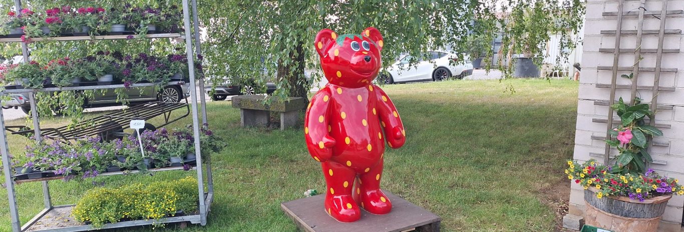 An der Einfahrt steht ein Leiterwagen mit einer großen roten Erdbeere. Sie können uns gar nicht verfehlen.